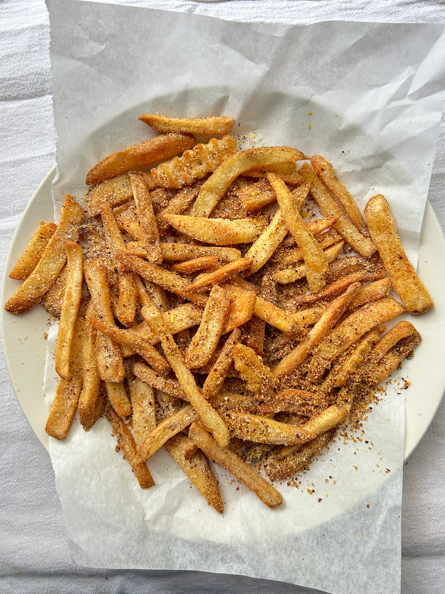 How It’s Going: Two words: frozen fries. Most restaurants that serve sicko delicious fries start with frozen fries. (I have a good Shake Shack story about that if you want to hear it!) Therefore, using frozen fries at home is the most cheffy thing you could possibly do. Work smarter, not harder! Newly energized by the idea of optimizing the roasting of said fries to make them the best they could be, I turned next to the seasoning that would make them unique and—well—extreme.